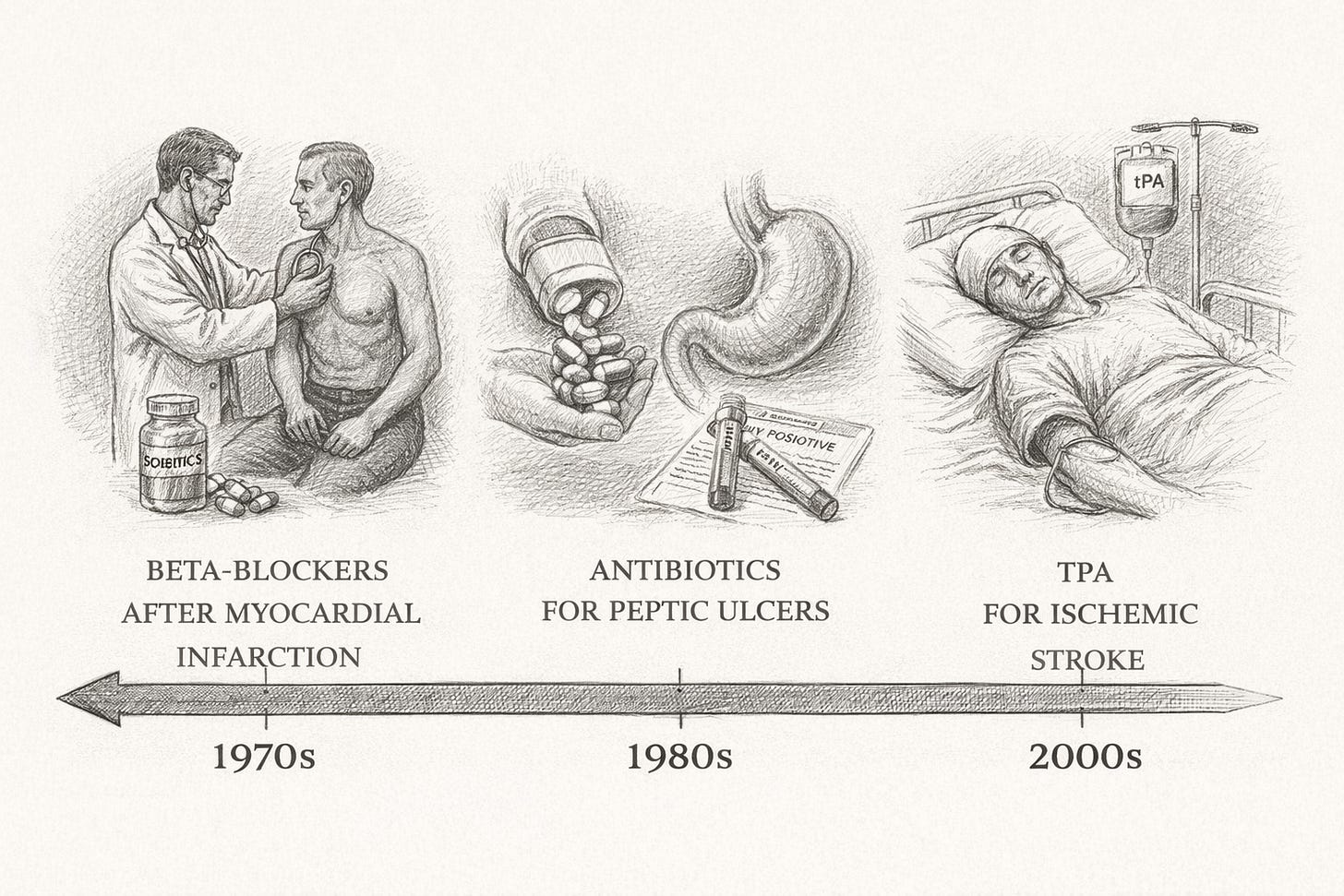 In the 1980s, Barry Marshall and Robin Warren demonstrated that most peptic ulcers were caused by Helicobacter pylori and could be treated with antibiotics. The prevailing paradigm — stress and acid — persisted long after evidence said otherwise. Patients endured chronic medication use, repeated hospitalizations, and unnecessary surgeries before antibiotic therapy became standard of care.